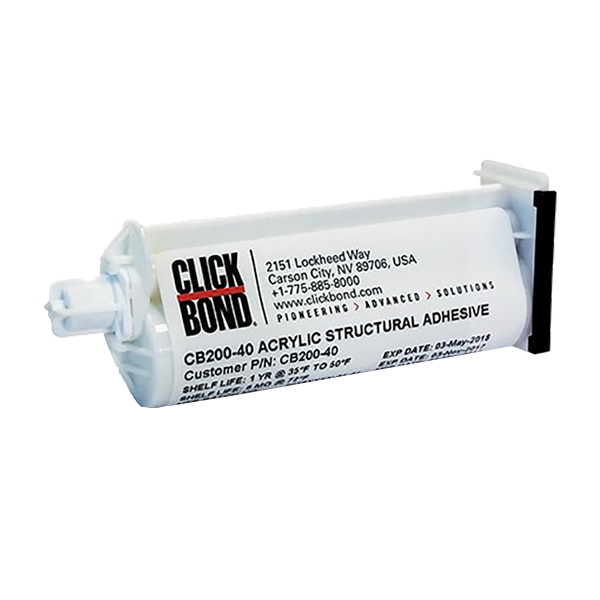 CB200 acrylic structural adhesive is a two part thixotropic paste adhesive capable of bonding a wide variety of metals, engineering thermoplastics, and composites. CB200 cures quickly at room temperature and exhibits excellent environmental and chemical resistance. CB200 adhesive replaces welding, riveting, and other mechanical fastening methods. CB200 is packaged in an 8:1 cartridge and is recommended for installation of Click Bond adhesive bonded fasteners.